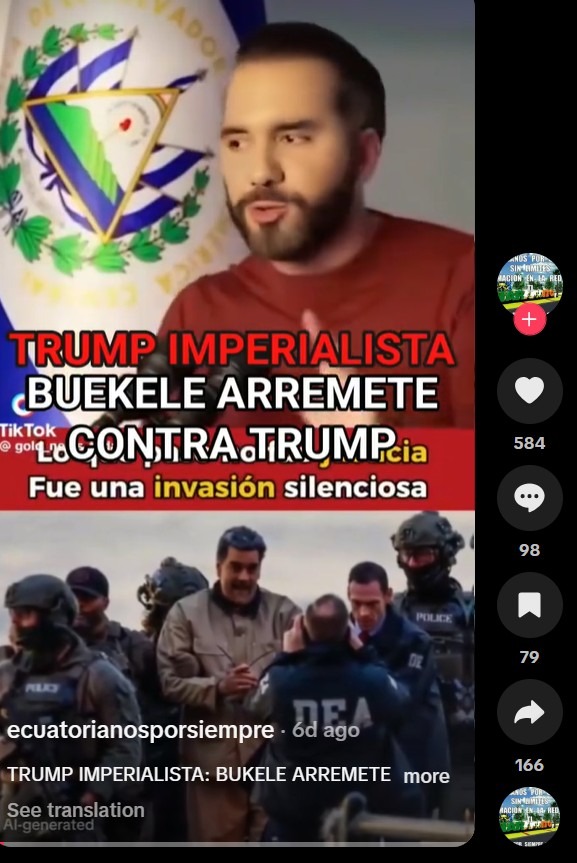 El click publicado por la cuenta de Tik Tok Ecuatorianos por siempre muestra la imagen del presidente salvadoreño arremetiendo por la detención del dictador venezolano y calificando de “dominación imperial” el operativo realizado por las fuerzas de seguridad estadounidenses.