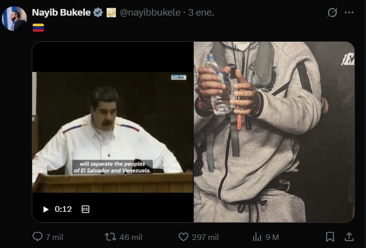 El mandatario salvadoreño solo publicó un emoji de la bandera de Venezuela con un video de archivo de Maduro, diciendo en un discurso que «Ningún “pelele” del imperialismo como el tal Bukele a a separar los pueblos de El Salvador y Venezuela», acompañado con una fotografía yuxtapuesta de Maduro esposado, la cual fue publicada previamente por Trump.