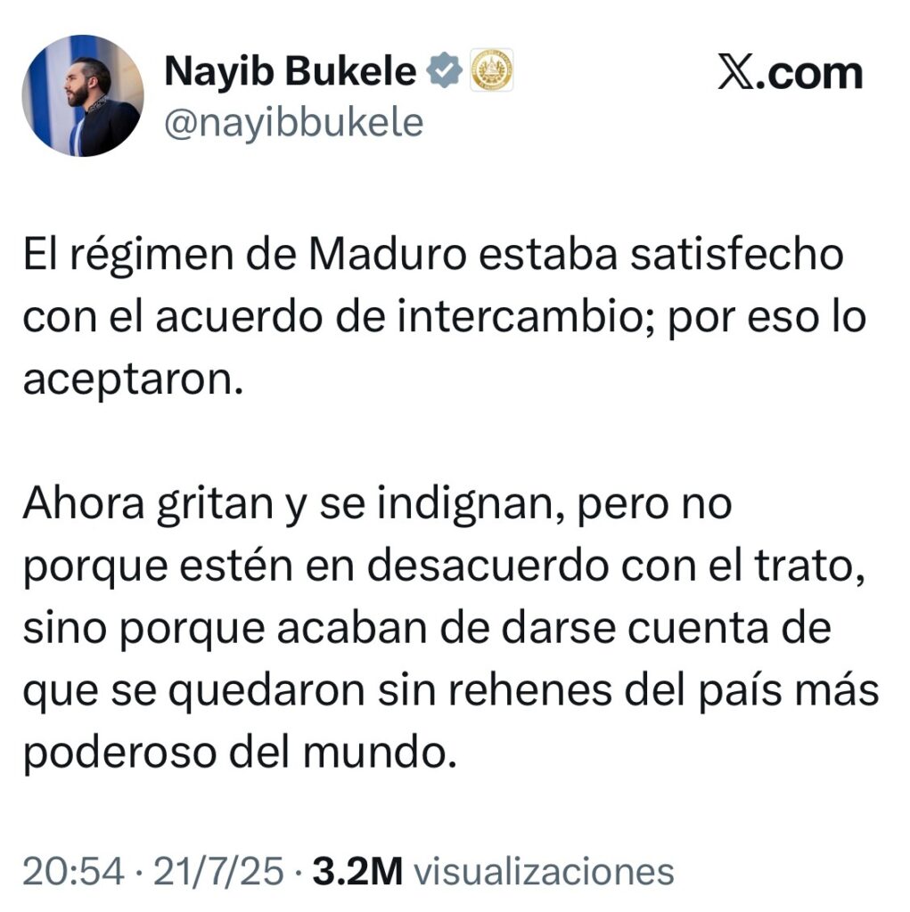 La última vez que Bukele escribió en su cuenta de X referente al régimen venezolano fue luego de que la Fiscalía venezolana anunció una investigación en contra de Bukele por supuestos abusos a migrantes venezolanos que fueron deportados por Estados Unidos hacia el Cecot