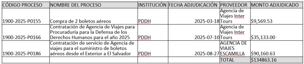 De acuerdo con cifras oficiales de compras consultadas por Infodemia, para el 2025 son al menos tres los procesos de adquisición abiertos por la PDDH, siendo adjudicado el primero en marzo pasado por $9,569.53 para dos boletos a Estrasburgo, Francia, en modalidad de “comparación de precios”.