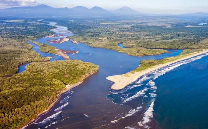 Foto aérea del desemboque del río Lempa. Foto: cortesía de Red Trinacional por el Rescate del Río Lempa/Infodemia.